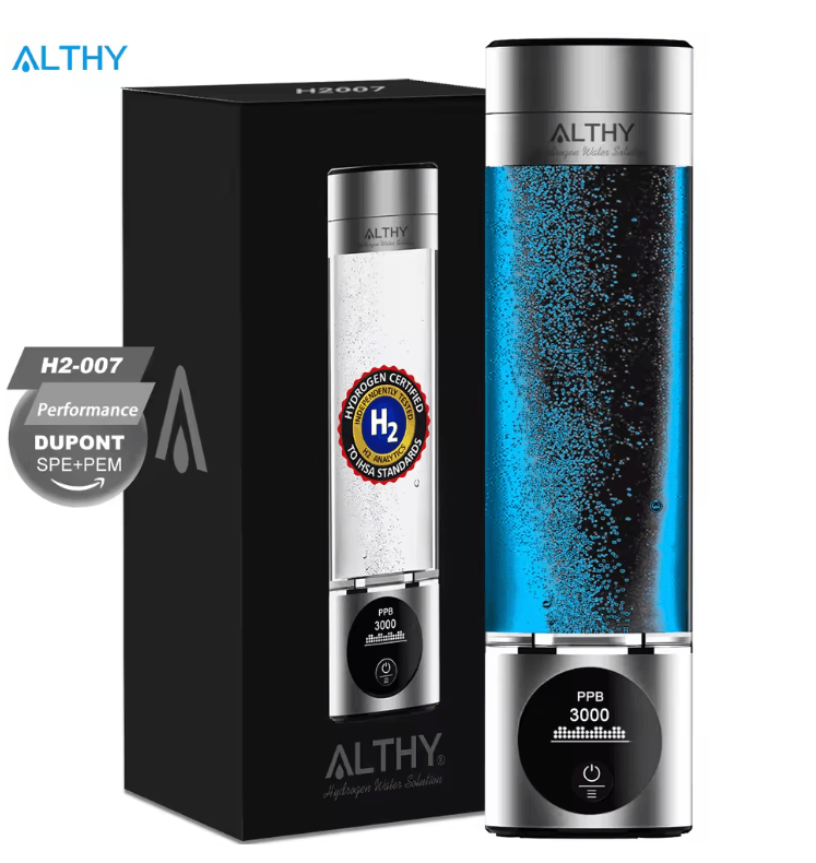 Boost your wellness routine with the hydrogen water generator designed to deliver clean, healthy, and energized hydration. Using advanced DuPont SPE and PEM dual chamber technology, it produces high purity hydrogen infused water that supports antioxidant activity, energy levels, and overall well being. With a built in PPB and time display, you can track hydrogen concentration for consistent results. Its versatile design also includes an H2 inhalation function, giving you even more ways to enjoy the benefits of hydrogen therapy. Key Features DuPont SPE and PEM dual chamber technology ensures high purity hydrogen water Built in PPB and time display lets you monitor hydrogen concentration in real time Multi functional design with hydrogen inhalation capability included Sleek and portable bottle design for home, office, gym, or travel use Easy to use, rechargeable system with long lasting performance Why Choose Our Althy Hydrogen Water Generator Bottle Unlike standard bottles, this advanced model combines drinking and inhalation functions for complete hydrogen therapy. Its SPE and PEM technology guarantees superior hydrogen purity compared to cheaper alternatives, while the built in display ensures you always know your waters quality. Many competitors lack these professional grade features, making this bottle a smarter investment for long term health. Perfect For Wellness enthusiasts seeking the benefits of hydrogen water therapy Athletes and active individuals who want to support energy and recovery Busy professionals looking for convenient daily hydration with added health benefits Anyone interested in portable hydrogen inhalation as part of their wellness routine Elevate Your Hydration Experience Refresh and recharge with the Althy Hydrogen Water Generator Bottle. Enjoy pure, antioxidant rich water and the added wellness benefits of hydrogen therapy anytime, anywhere.