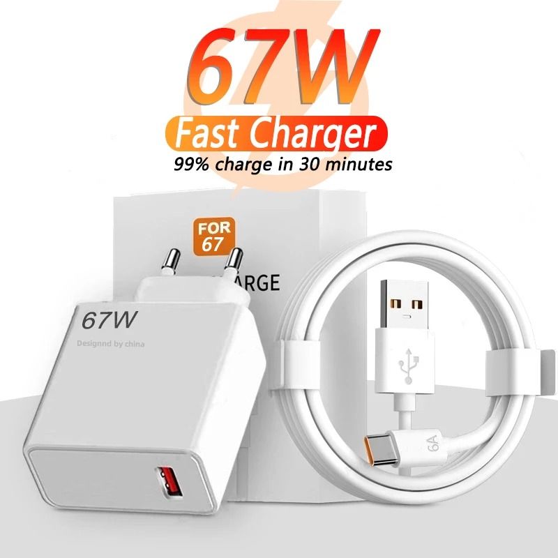 Professional 67W USB Turbo Fast Charger & 6A TypeC Cable SetPower your mobile life with the speed and reliability of the 67W Turbo Fast Charger, engineered to deliver peak performance for your modern devices. This highperformance charging suite is specifically designed for flagship power, providing a specialized “HyperCharge” experience for compatible smartphones. Featuring an intelligent identification chip, it automatically detects your device to deliver the safest and most efficient power output possible. Whether you are at home or in the office, this 67W USB fast charger is the “divine tool” for rapid recovery, ensuring you stay connected throughout your busiest days. Experience the convenience of professionalgrade charging with this essential quick charge TypeC set.Key Features67W Turbo Power Output: Delivers a maximum output of 20V3.25A, capable of charging highpower devices to 100% in as little as 38 minutes.6A HighCurrent TypeC Cable: Includes a premium 1m (~39.37 in) data cable with a builtin identification chip to support ultrafast 6A current delivery.Intelligent Identification Chip: Automatically assigns the optimal charging mode and power levels for smartphones, laptops, and tablets.Advanced Safety Protection: Constructed with UL94V0 fireresistant materials and features builtin protection against overvoltage and overheating.Universal Voltage Support: Compatible with 100240V input, making it a perfect highvalue travel companion for worldwide use.Why Choose Our 67W Turbo Fast Charger Set Generic chargers often struggle to activate proprietary fastcharging protocols, leading to slow and inconsistent power delivery. Our 67W Turbo Quick Charge kit is designed to fully unlock your device’s maximum charging speed, providing a “HyperCharge” animation on compatible screens. Unlike standard adapters, this set includes a specialized 6A cable that is essential for reaching 67W performance. It offers a professional, showroomquality charging experience that is significantly faster than standard 33W alternatives.Perfect ForFlagship Smartphone Users: Achieving maximum speeds for highend mobile series.ProSeries Devices: Ideal for Note and Pro model devices requiring highwattage input.OntheGo Professionals: Powering laptops and tablets with a compact, highefficiency charger.Modern Travelers: Relying on one safe and powerful adapter for multiple TypeC electronic devices.Product SpecsInput: 100240V, 5060Hz, 1.7A.Output: 5V3A, 9V3A, 11V6.1A Max, 20V3.25A Max.Max Power: 67W.Dimensions: ~55.9 x 49.3 x 28mm (~2.20 x 1.94 x 1.10 in).Cable Length: 1m (~39.37 in).