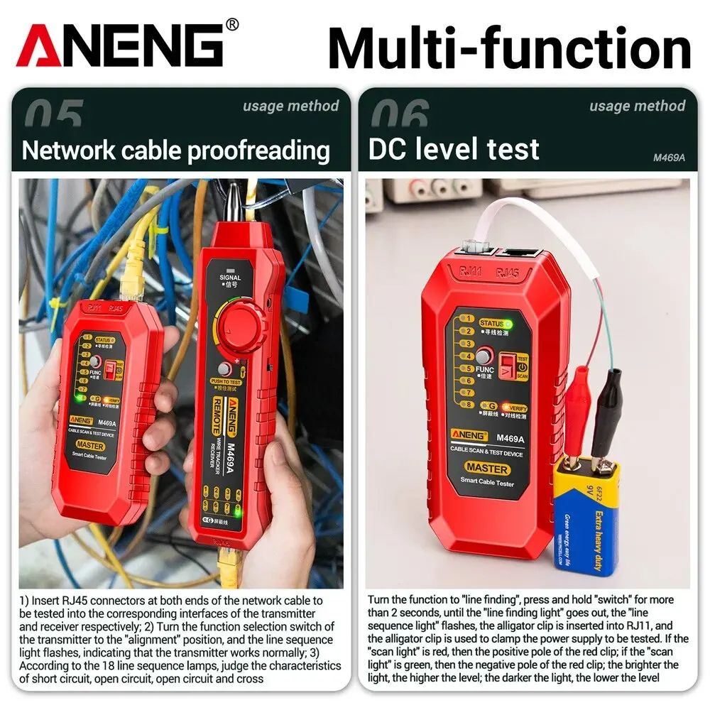 The ANENG M469A Smart Network Cable Tester is an essential tool for professionals and DIY enthusiasts aiming to maintain and troubleshoot network systems efficiently. Key Features: Versatile Cable Compatibility: Supports both RJ45 and RJ11 connectors, making it suitable for Ethernet and telephone cables. Comprehensive Testing Functions: Capable of performing open and short circuit tests, DC voltage detection, and network line tracing to ensure cable integrity. Wire Tracking Capability: The builtin wire tracker assists in locating cables within complex network setups, streamlining the troubleshooting process. UserFriendly Design: Features adjustable volume control and an earphone jack for clear signal detection, even in noisy environments. Additional Utilities: Includes a low voltage warning system and a builtin flashlight, enhancing usability in various working conditions. Specifications: Model: M469A Interfaces: RJ45, RJ11 Material: Durable ABS plastic Power Supply: 9V 6F22 battery (not included) Weight: Transmitter 62g; Receiver 77g Enhance your network maintenance toolkit with the ANENG M469A Smart Network Cable Tester, designed for accurate diagnostics and efficient troubleshooting.